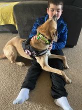Mason can now confidently handle Biscuit in public, and when he’s having a hard moment, he can tell her “pressure,” and she lays across him to help him calm down. It’s amazing to watch.